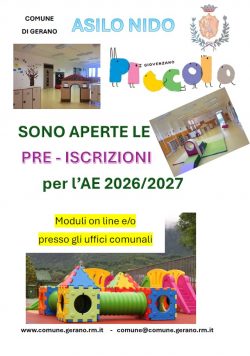 Il Comune di Gerano comunica che sono ufficialmente aperte le pre-iscrizioni per l’Anno Educativo 2026 /2027